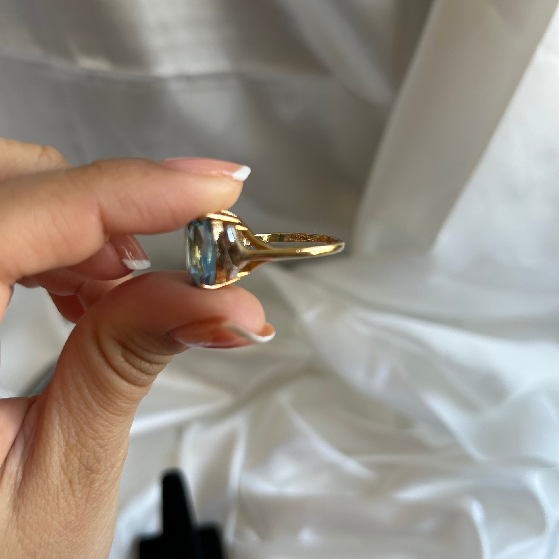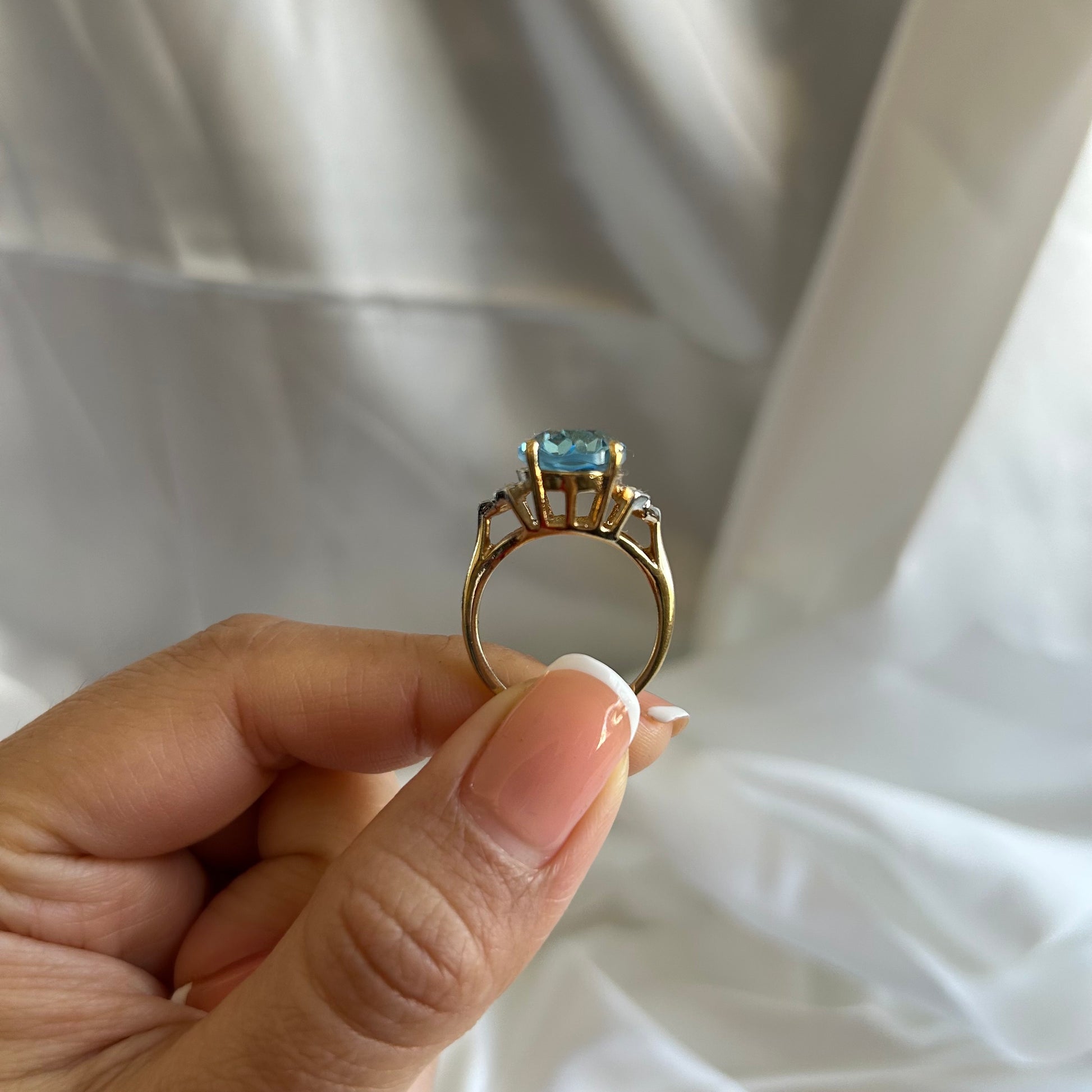 Really beautiful 18k HGE blue topaz ring. Large center stone with dainty rhinestone accents. Size US 7 3/4. Ships with ring box and cleaning cloth.