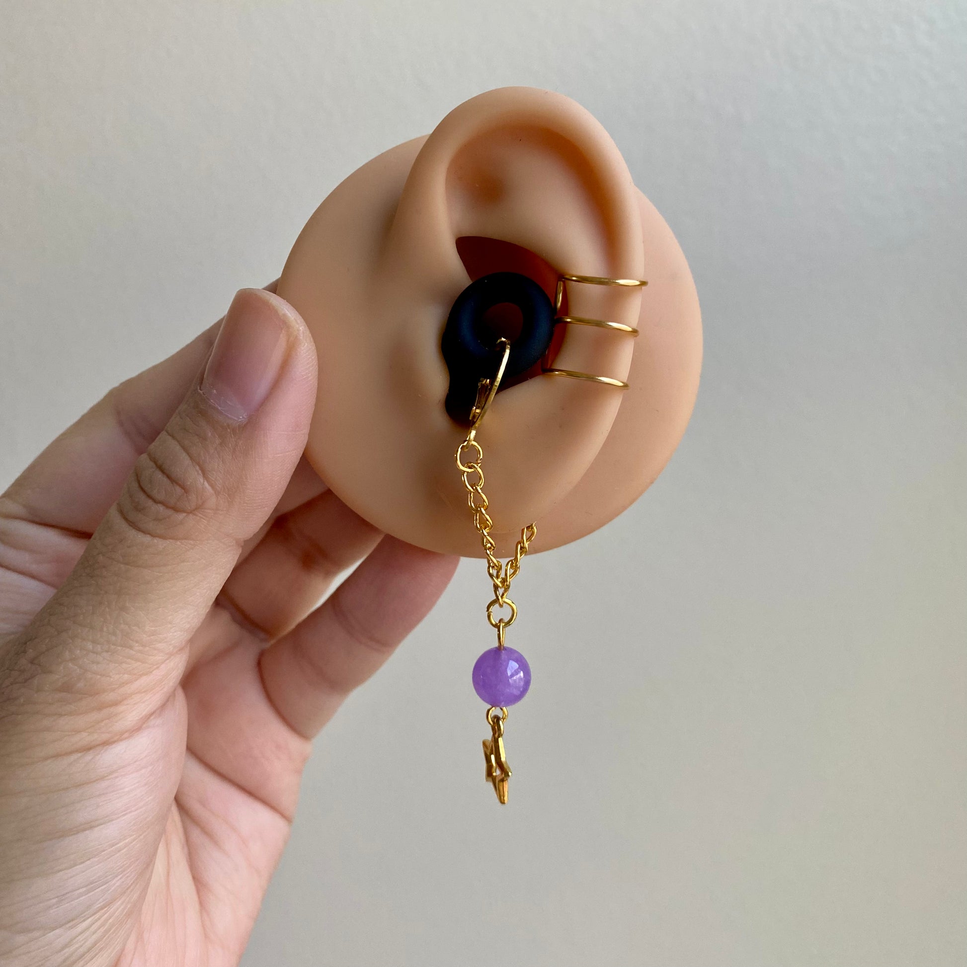 Made with gold tone wire, gold tone chain, gold tone charms, amethyst beads, and stainless steel clips. Open the clip to attach your ear plugs. Loop ear plugs are not included!