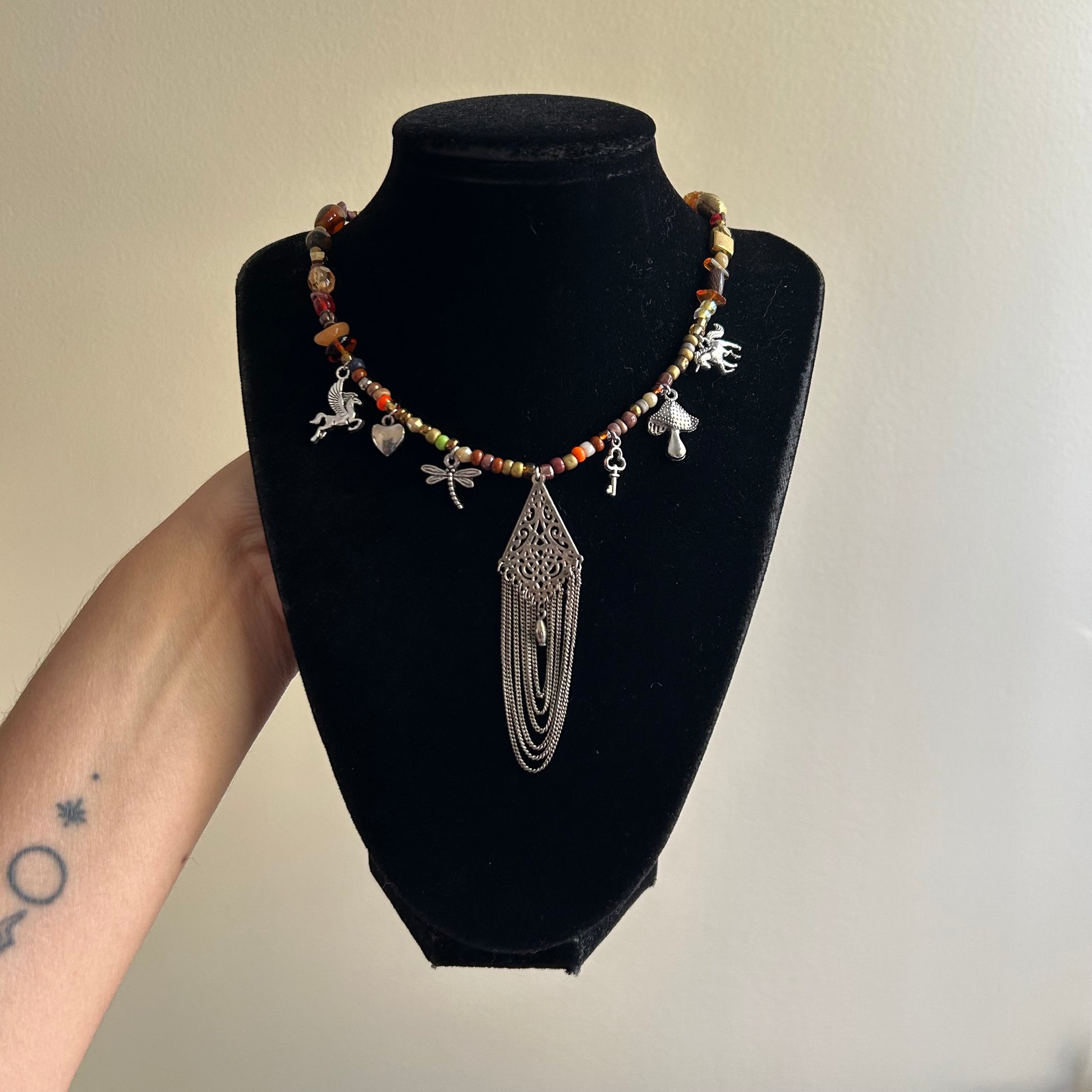 You can find a video on my tiktok and Instagram of me creating this necklace. Made with a variety of mixed metals, vintage beads, repurposed charms, glass beads, plastic beads, and stainless steel wire. Adjustable from 16 - 18 inches long. Handmade by me. ONE OF A KIND.