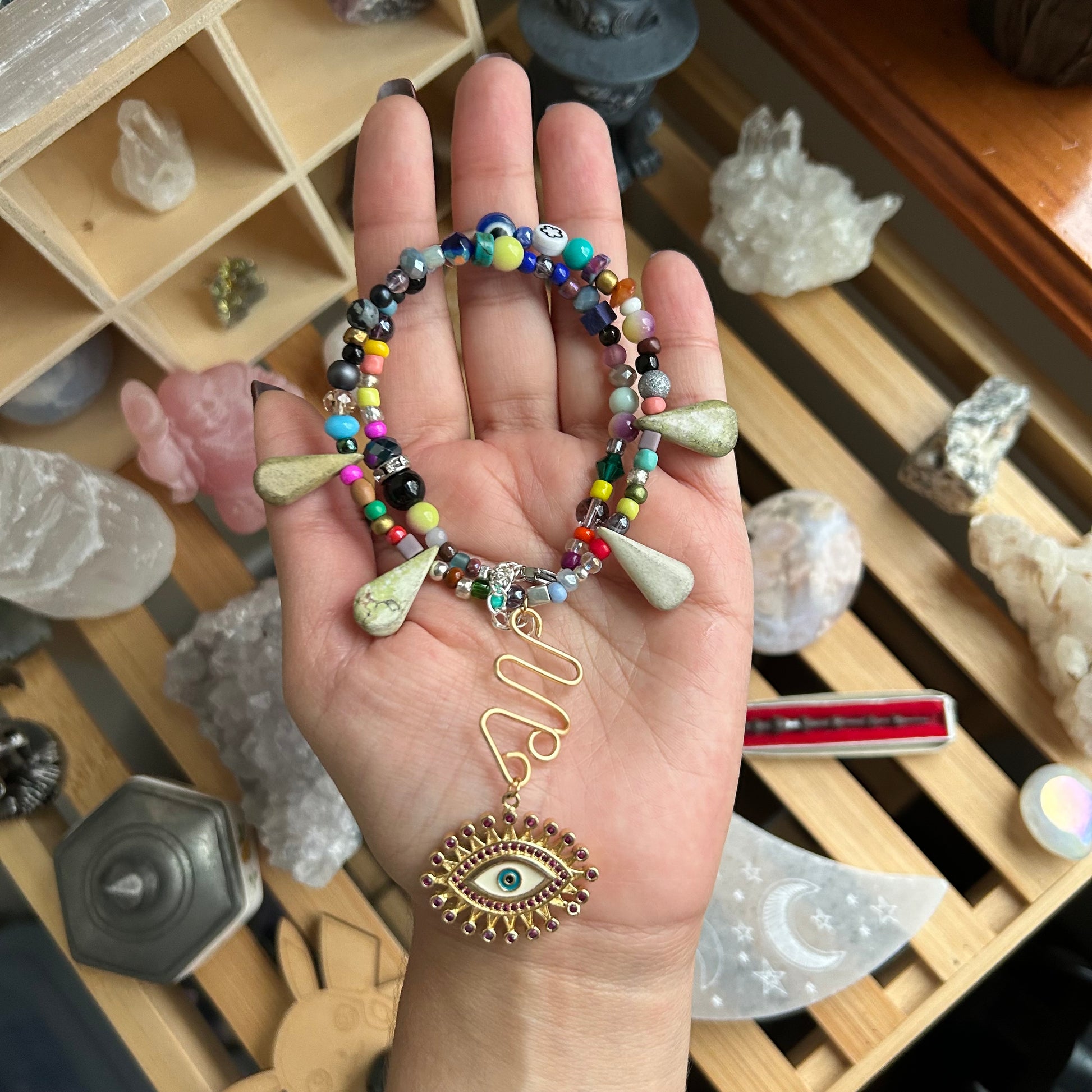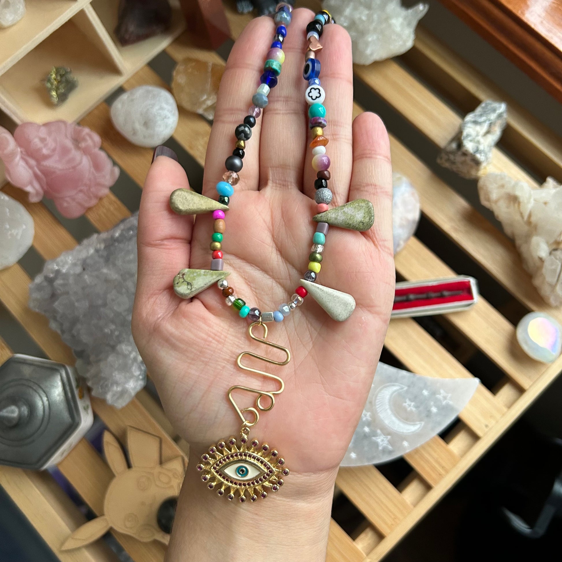 You can find a video on my tiktok and Instagram of me creating this necklace. Made with a variety of mixed metals, vintage beads, repurposed charms, glass beads, plastic beads, and stainless steel wire. Adjustable from 15 - 17 inches long. Handmade by me. ONE OF A KIND.