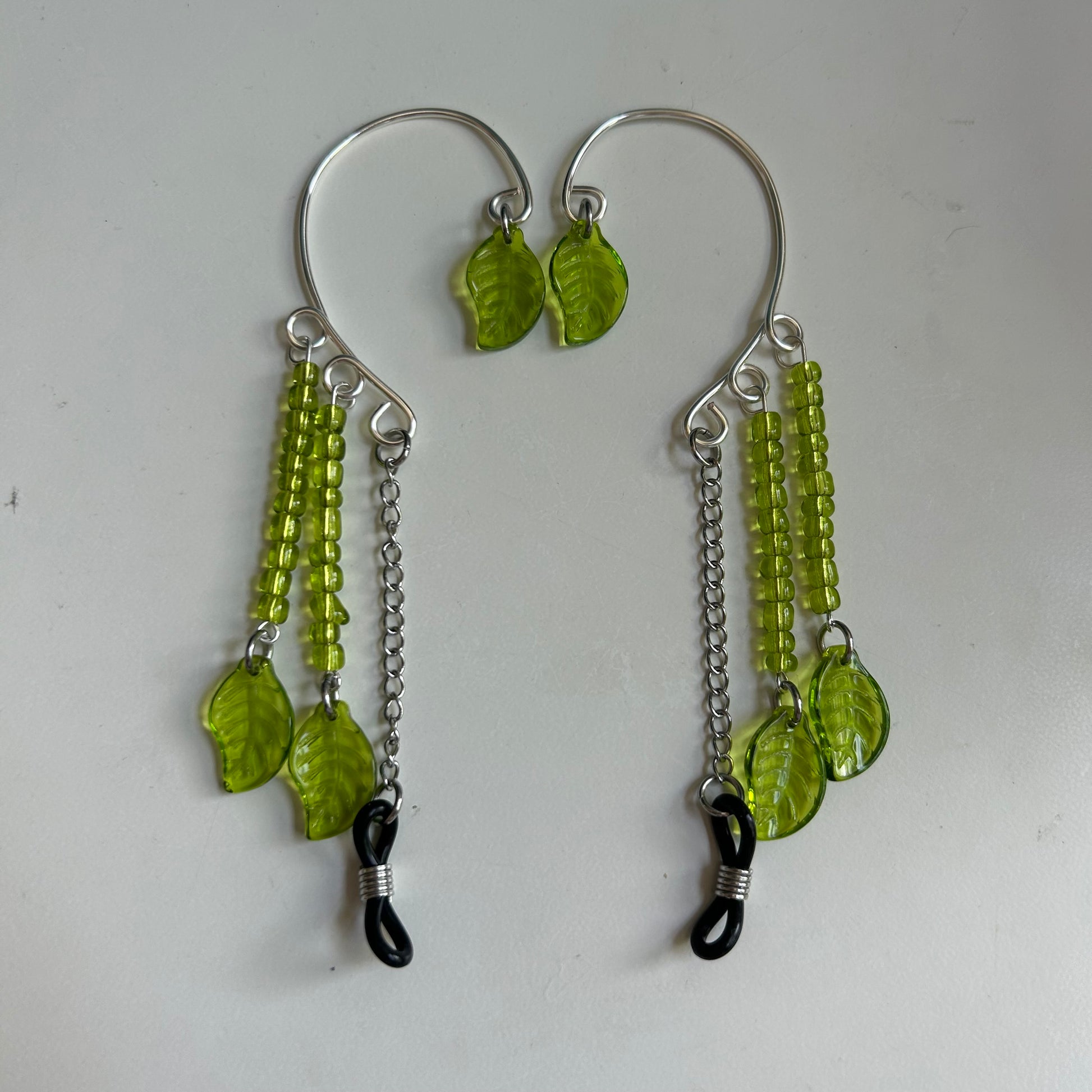 Made with silver tone jewelry wire, silver tone chain, glass beads, and rubber loops. Ear cuffs are adjustable. No piercings needed! Please make sure the ear cuffs are secure to your ears and the earbuds/AirPods are tightly secure to the rubber loops before wearing them out. Each side weighs about 0.4 ounces.