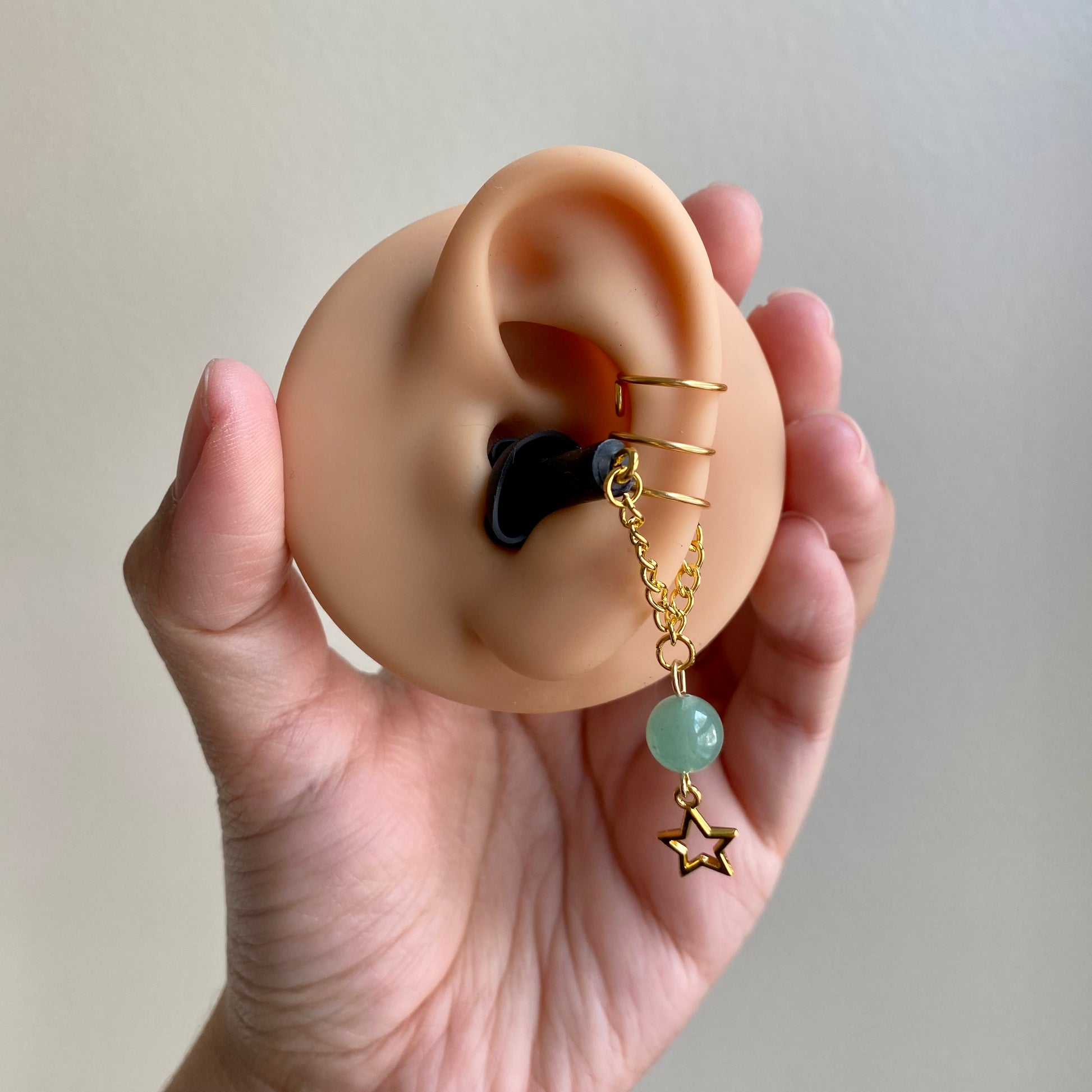Made with gold tone wire, gold tone chain, gold tone charms, green aventurine beads, and reusable silicon ear plugs.