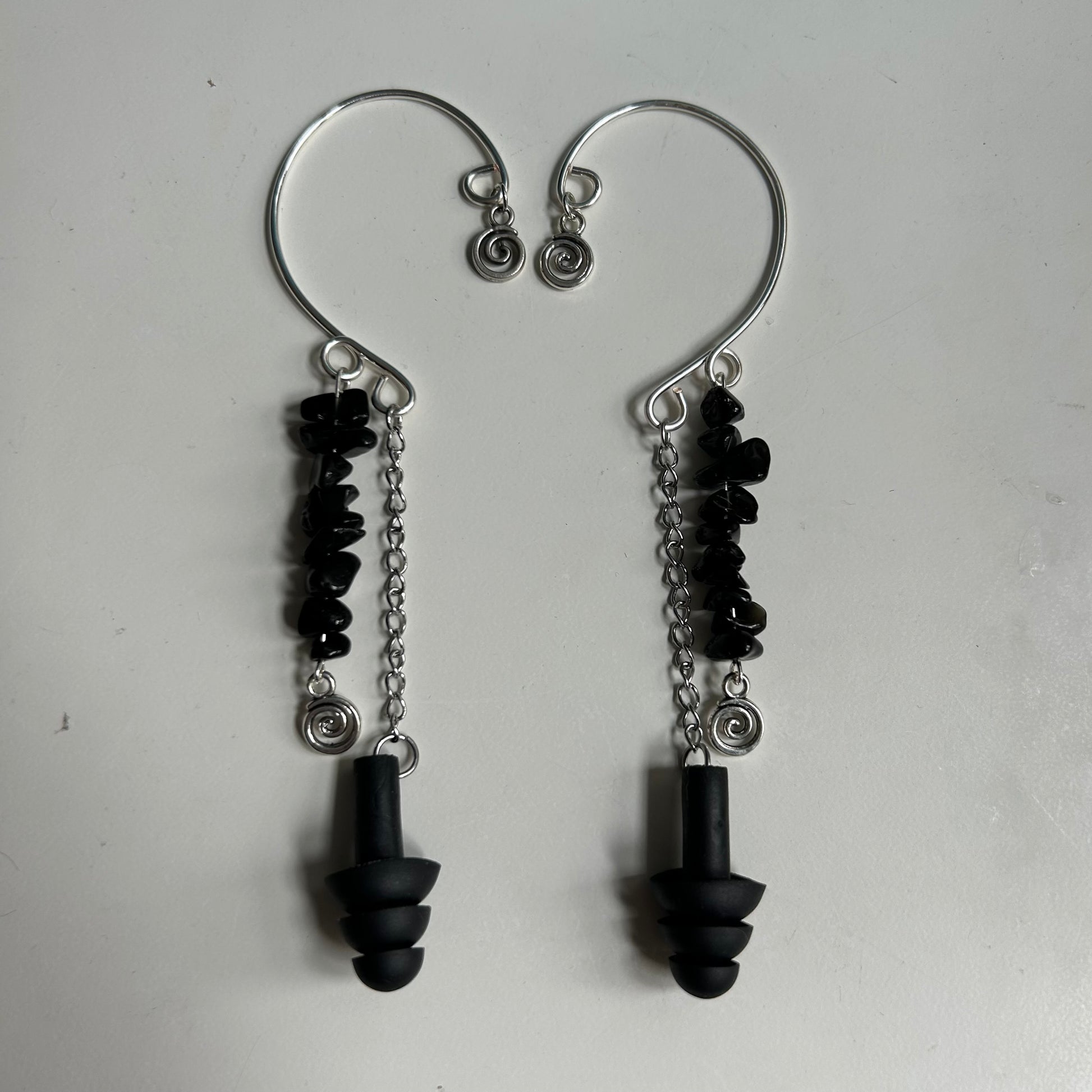 Made with silver tone tarnish resistant copper wire, black jasper, silver tone charms, stainless steel chain, and reusable silicon ear plugs. Ear cuff bases are easily adjustable to your ears and can even fit kids. The heaviest ear cuffs weigh about .4 oz or 8 grams. The ear cuffs come in pairs, so you will receive two (one for each ear). You do not need any piercings to wear them and since they do not go inside of a piercing, a lot of people who have metal allergies can wear the ear cuffs with no problem. Please keep the ear cuffs away from water and store them in a dark place like a jewelry box.