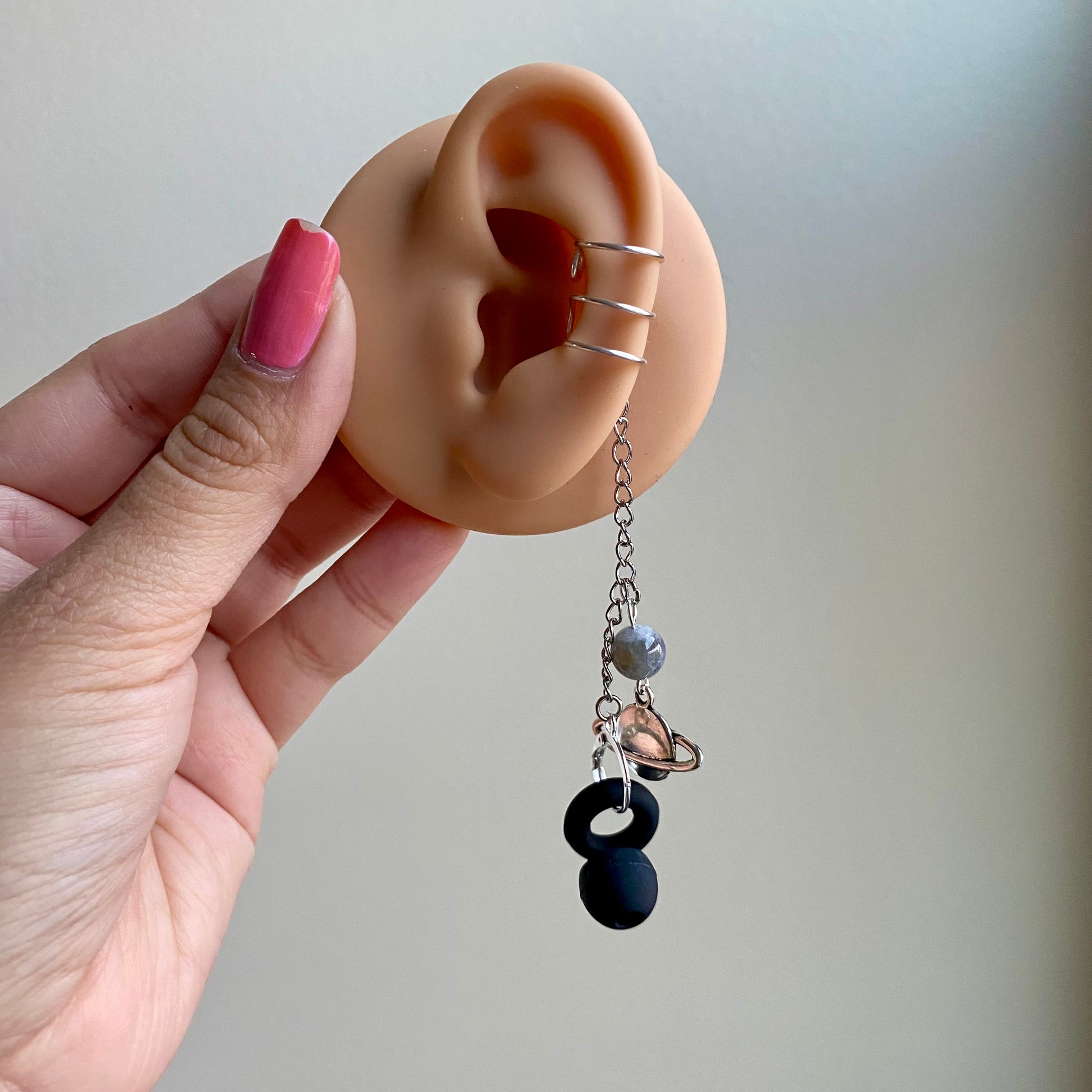 Made with silver tone wire, silver tone chain, silver tone charms, labradorite beads, and stainless steel clips. Open the clip to attach your ear plugs. Loop ear plugs are not included!