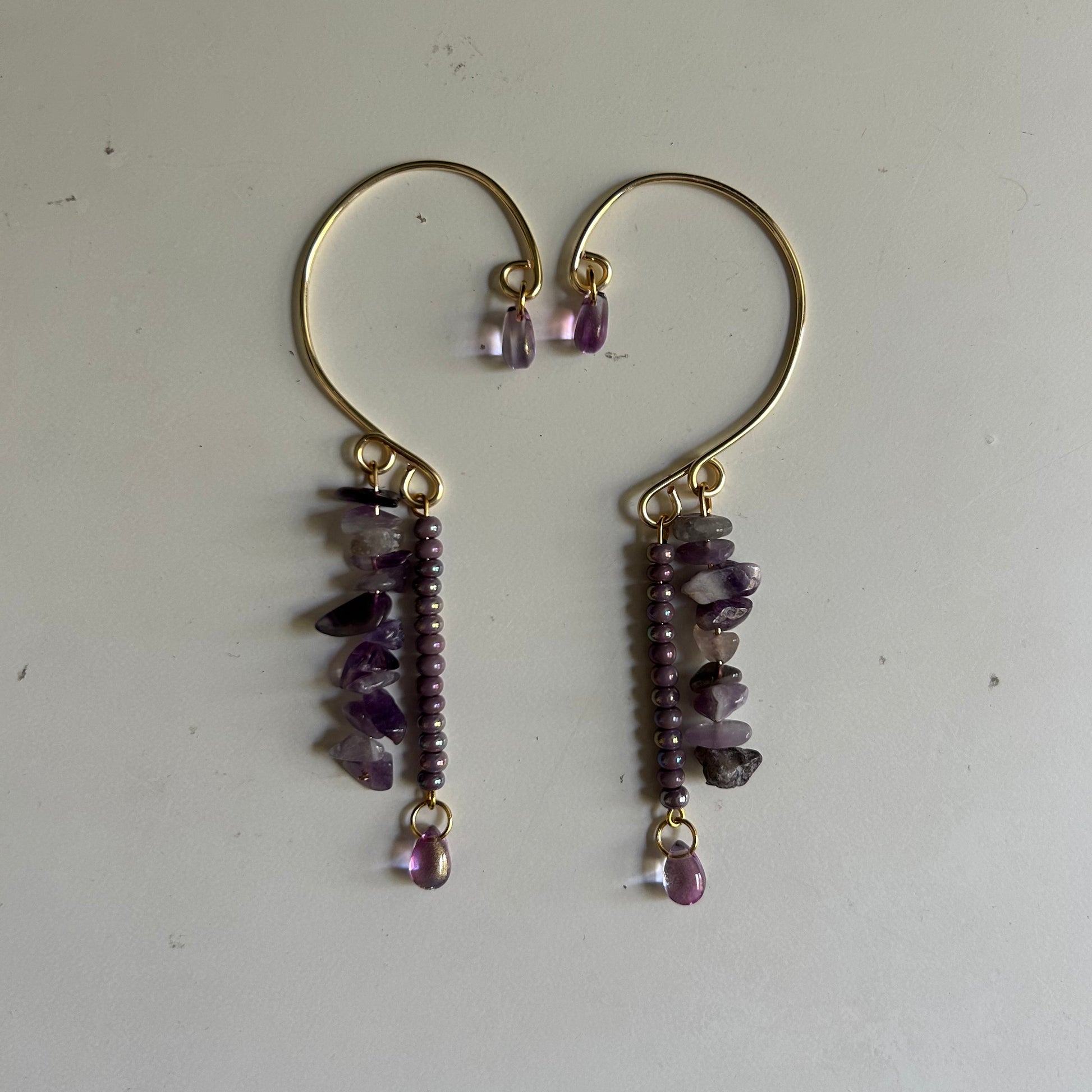 Made with gold tone tarnish resistant copper wire, glass beads, and amethyst. Ear cuff bases are easily adjustable to your ears and can even fit kids. The heaviest ear cuffs weigh about .4 oz or 8 grams. The ear cuffs come in pairs, so you will receive two (one for each ear). You do not need any piercings to wear them and since they do not go inside of a piercing, a lot of people who have metal allergies can wear the ear cuffs with no problem. Please keep the ear cuffs away from water and store them in a dark place like a jewelry box.