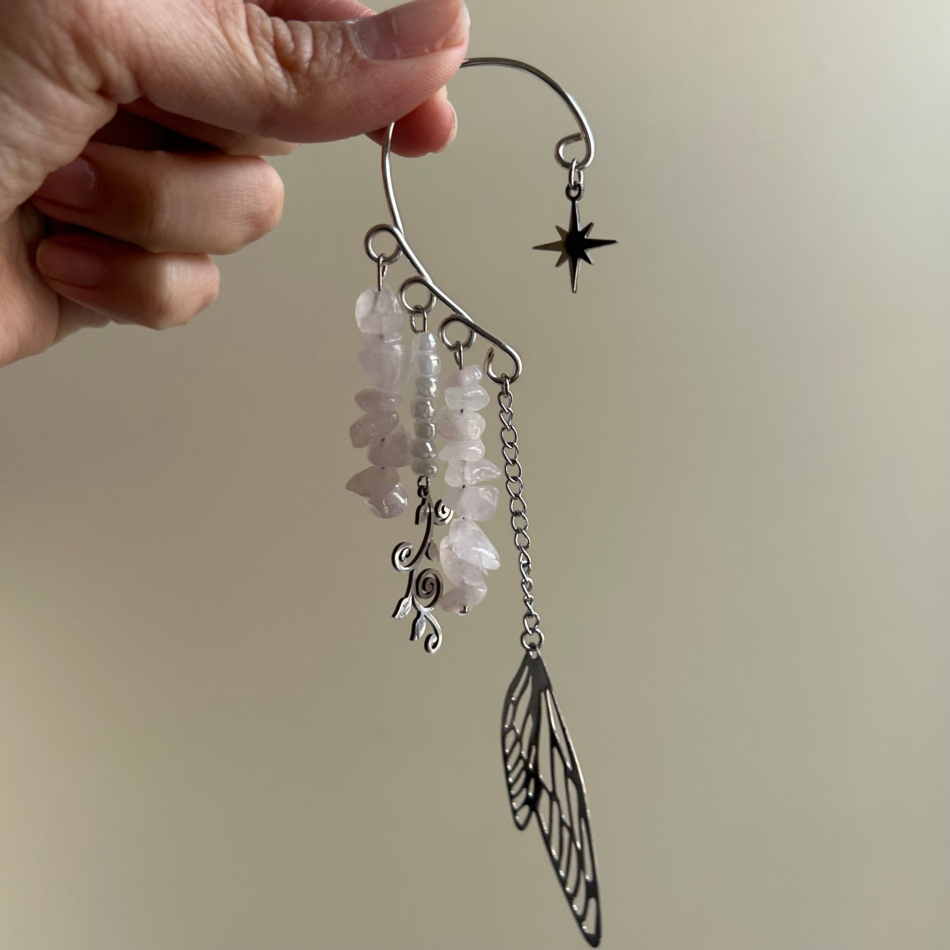 Made with silver tone tarnish resistant copper wire, stainless steel charms, stainless steel chain, glass beads, and rose quartz. Ear cuff bases are easily adjustable to your ears and can even fit kids. The heaviest ear cuffs weigh about .4 oz or 8 grams. The ear cuffs come in pairs, so you will receive two (one for each ear). You do not need any piercings to wear them and since they do not go inside of a piercing, a lot of people who have metal allergies can wear the ear cuffs with no problem. Please keep the ear cuffs away from water and store them in a dark place like a jewelry box.