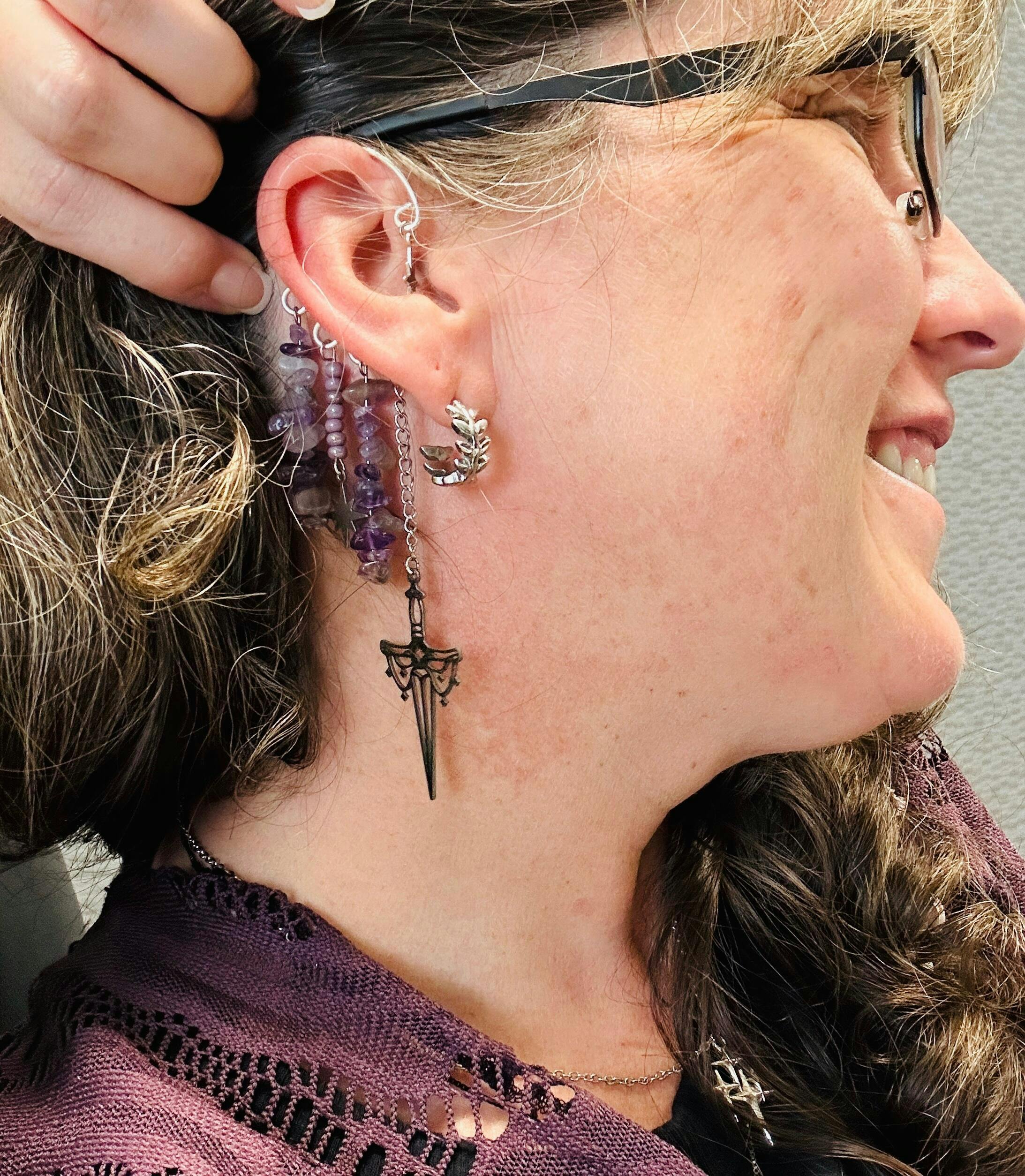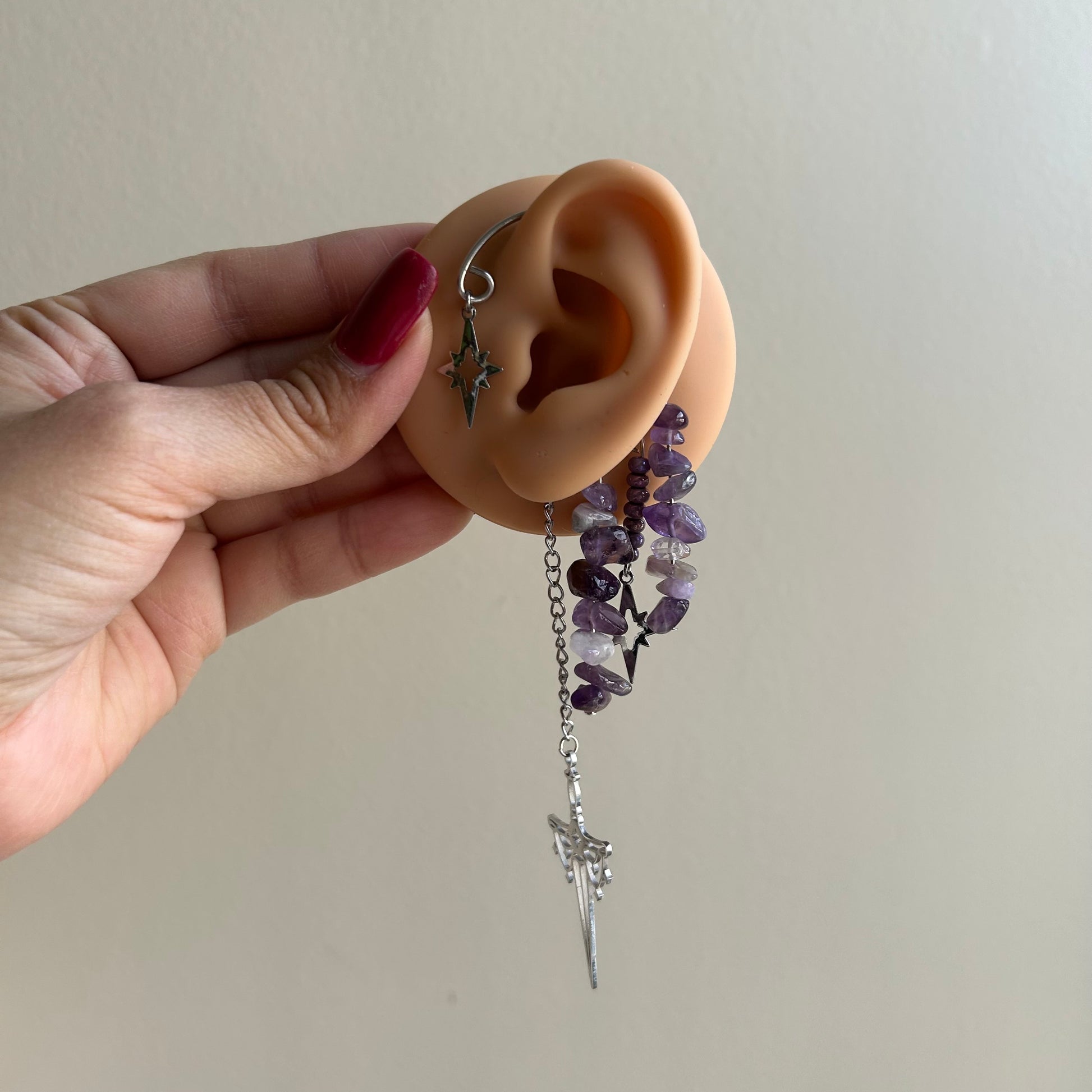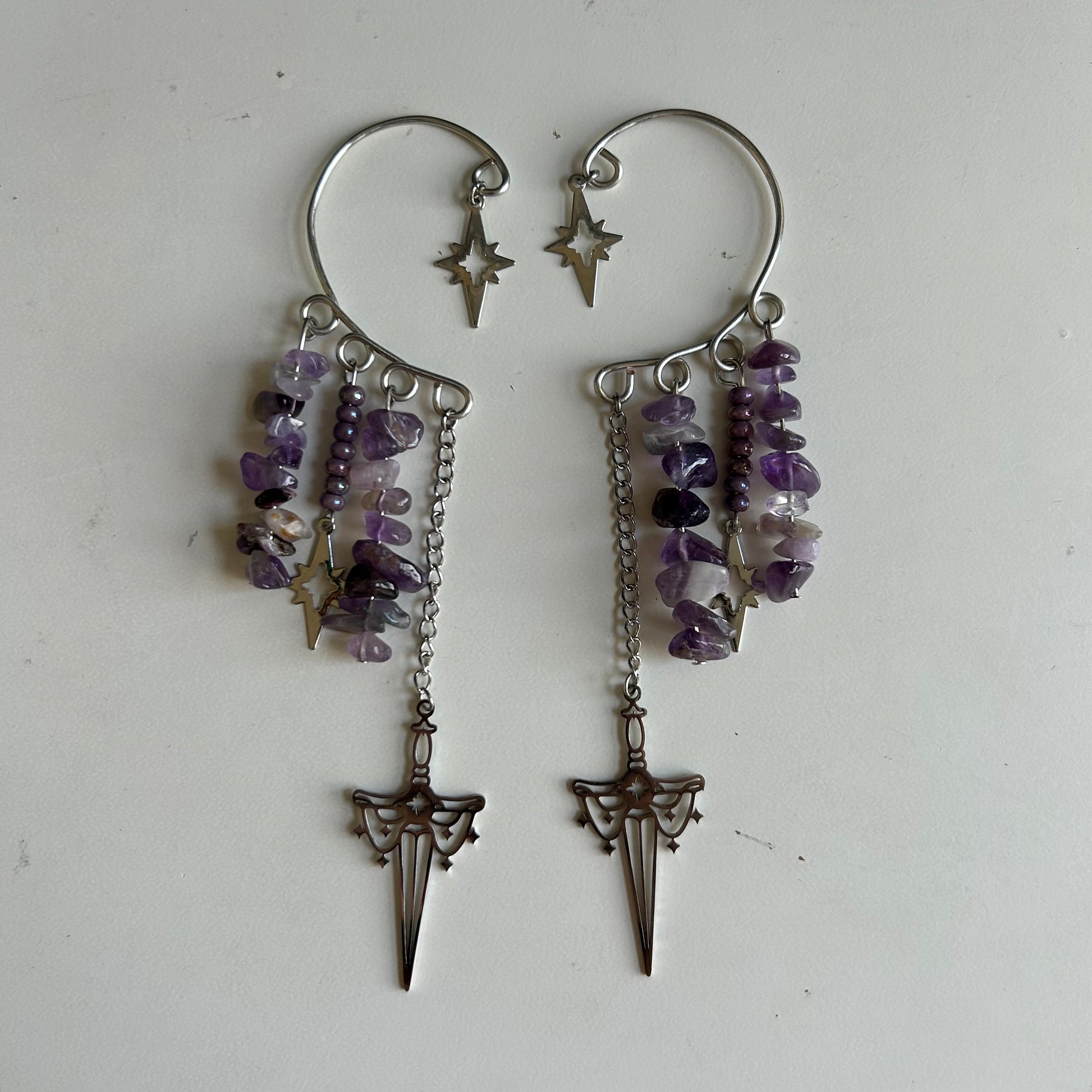 Made with silver tone tarnish resistant copper wire, silver tone charms, silver tone chain, glass beads, and amethyst. Ear cuff bases are easily adjustable to your ears and can even fit kids. The heaviest ear cuffs weigh about .4 oz or 8 grams. The ear cuffs come in pairs, so you will receive two (one for each ear). You do not need any piercings to wear them and since they do not go inside of a piercing, a lot of people who have metal allergies can wear the ear cuffs with no problem. Please keep the ear cuffs away from water and store them in a dark place like a jewelry box.