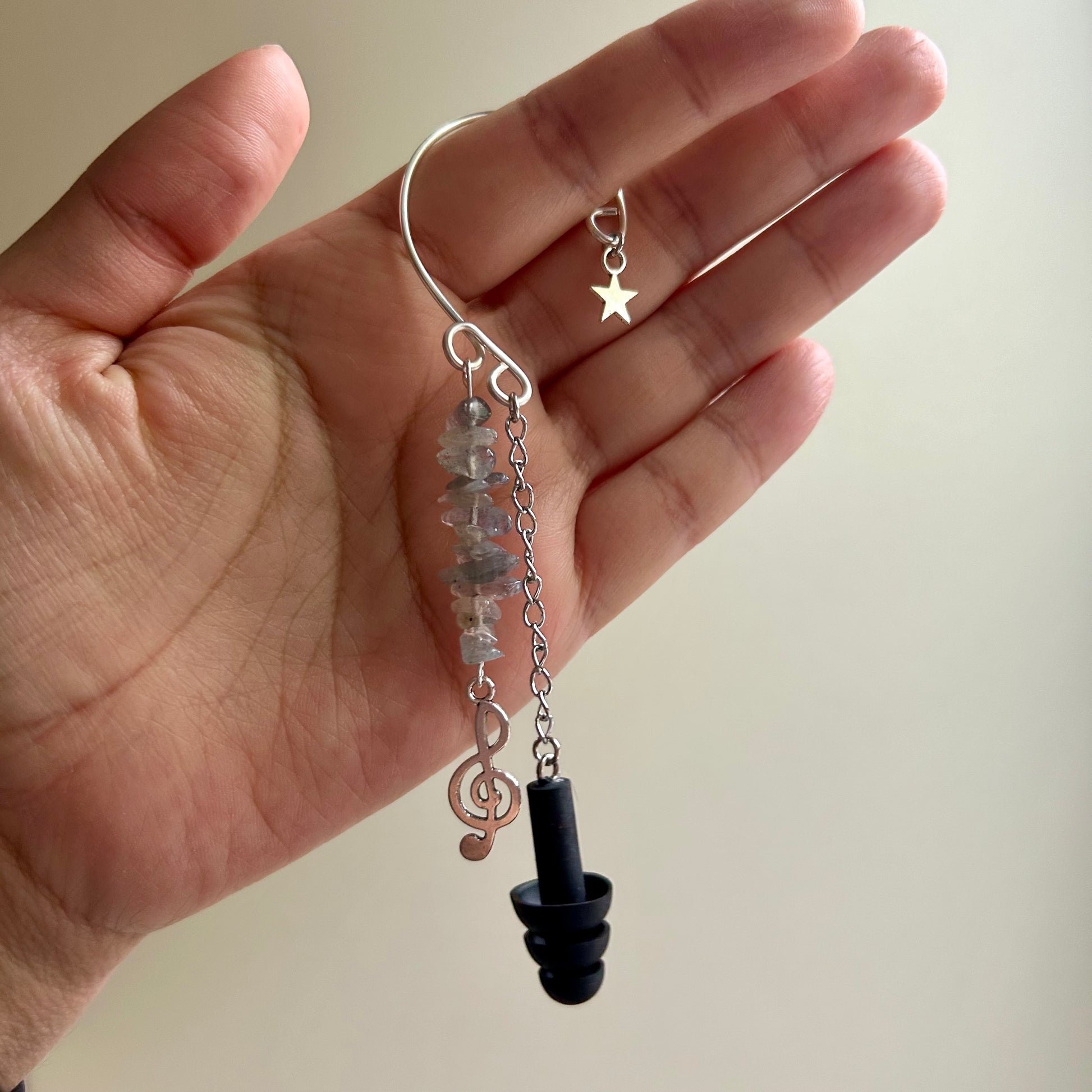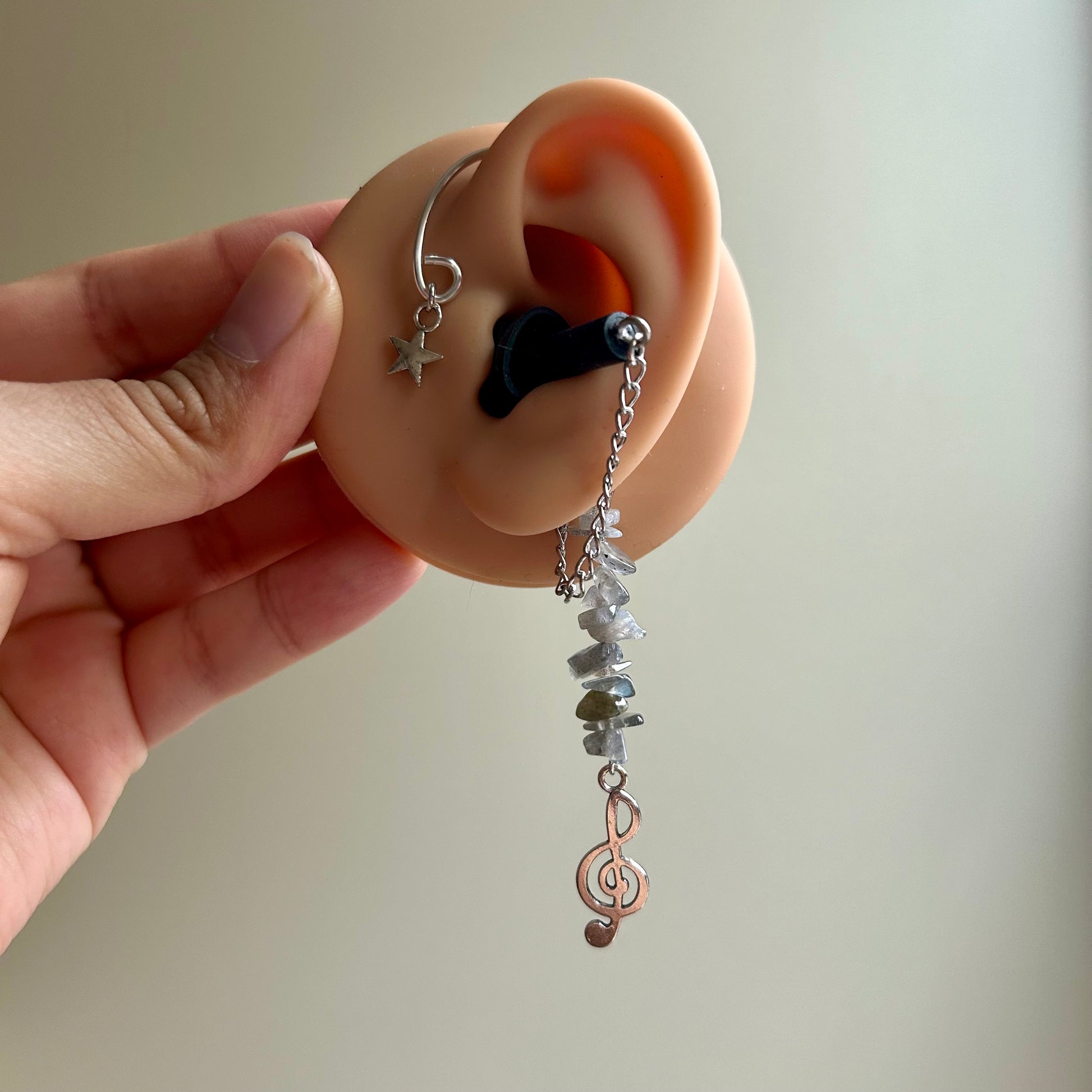 Made with silver tone tarnish resistant copper wire, labradorite, silver tone charms, stainless steel chain, and reusable silicon ear plugs. Ear cuff bases are easily adjustable to your ears and can even fit kids. The heaviest ear cuffs weigh about .4 oz or 8 grams. The ear cuffs come in pairs, so you will receive two (one for each ear). You do not need any piercings to wear them and since they do not go inside of a piercing, a lot of people who have metal allergies can wear the ear cuffs with no problem. Please keep the ear cuffs away from water and store them in a dark place like a jewelry box.