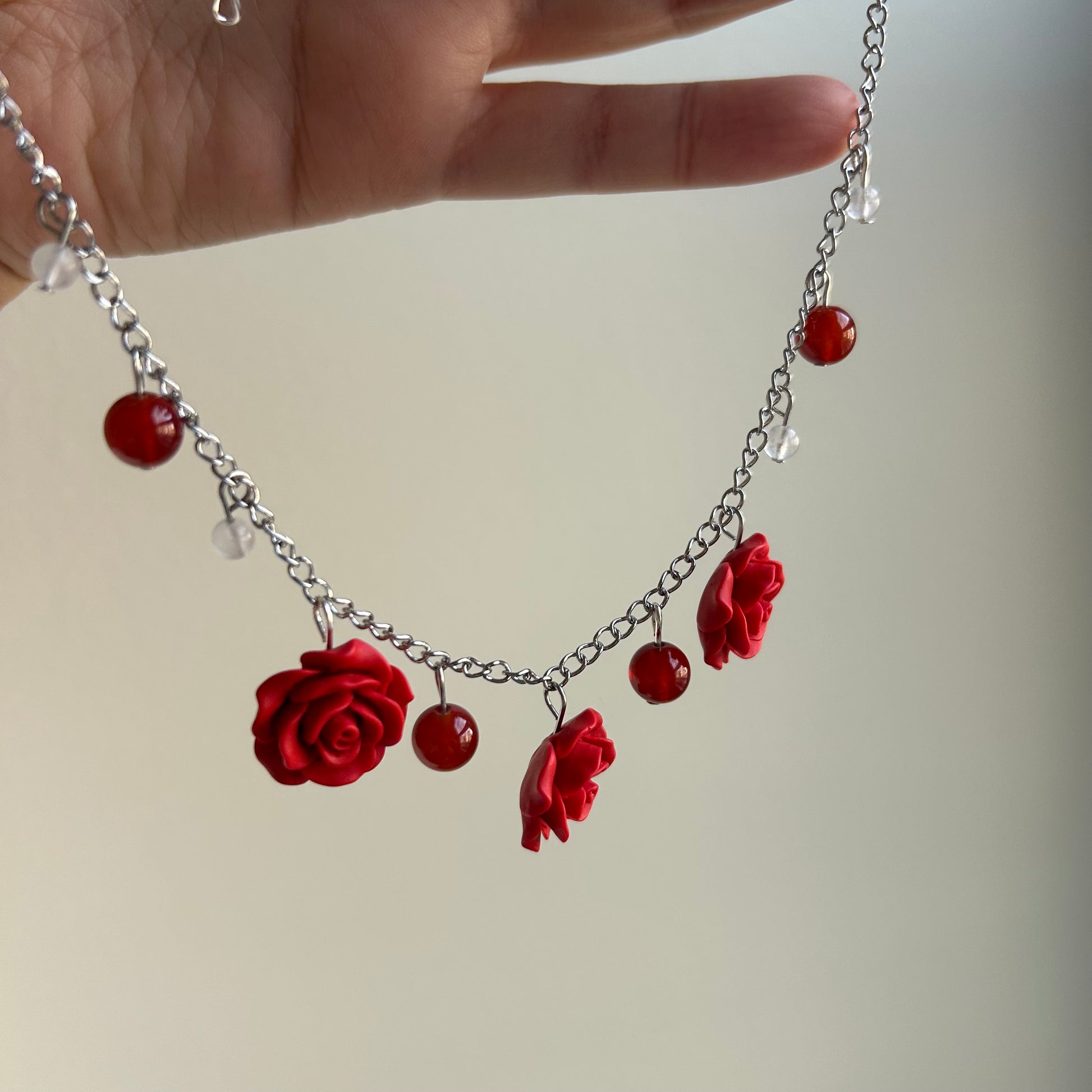 Made with stainless steel chain, clear quartz, carnelian, and imitation cinnabar roses. Adjustable from 17 - 19.5 inches long. Handmade.