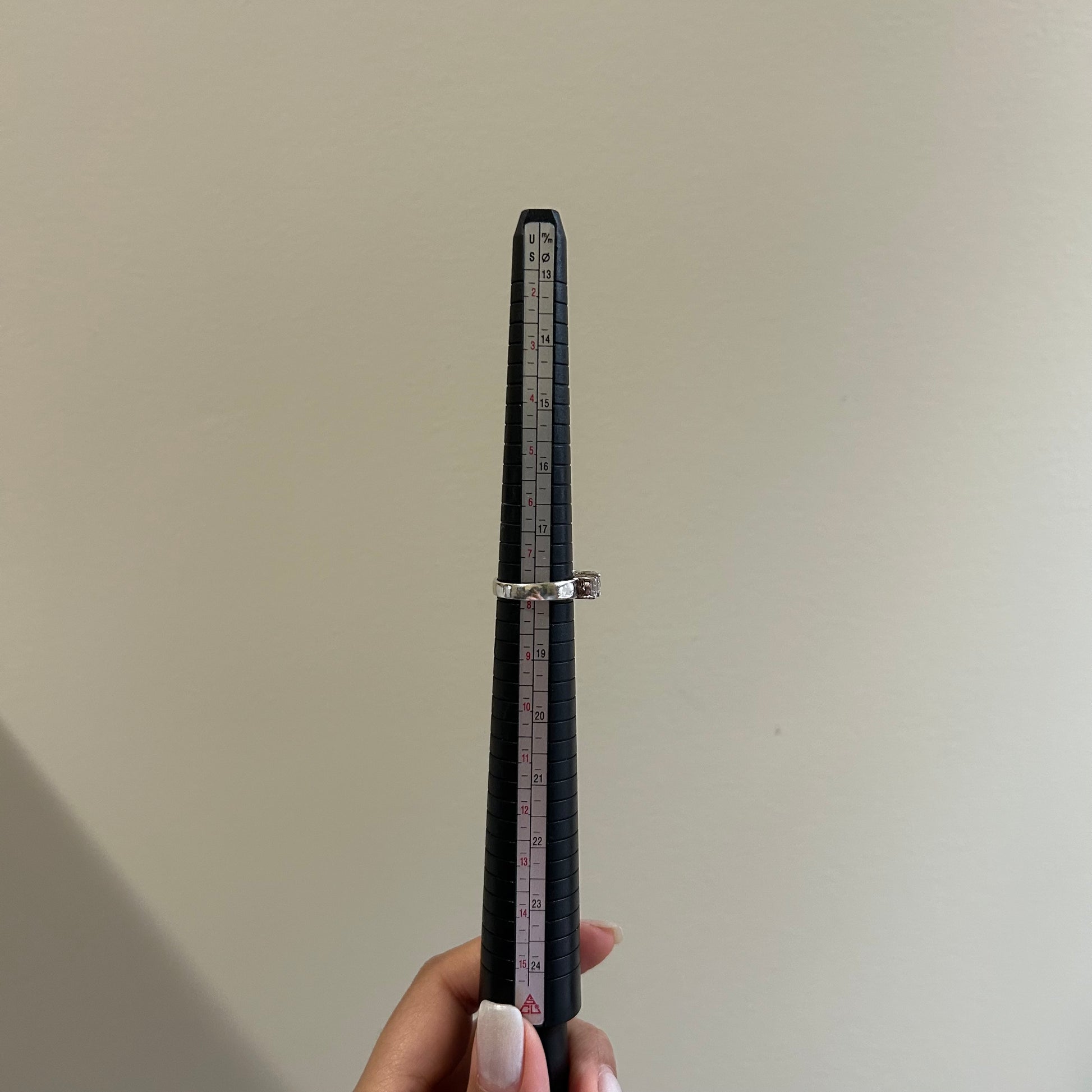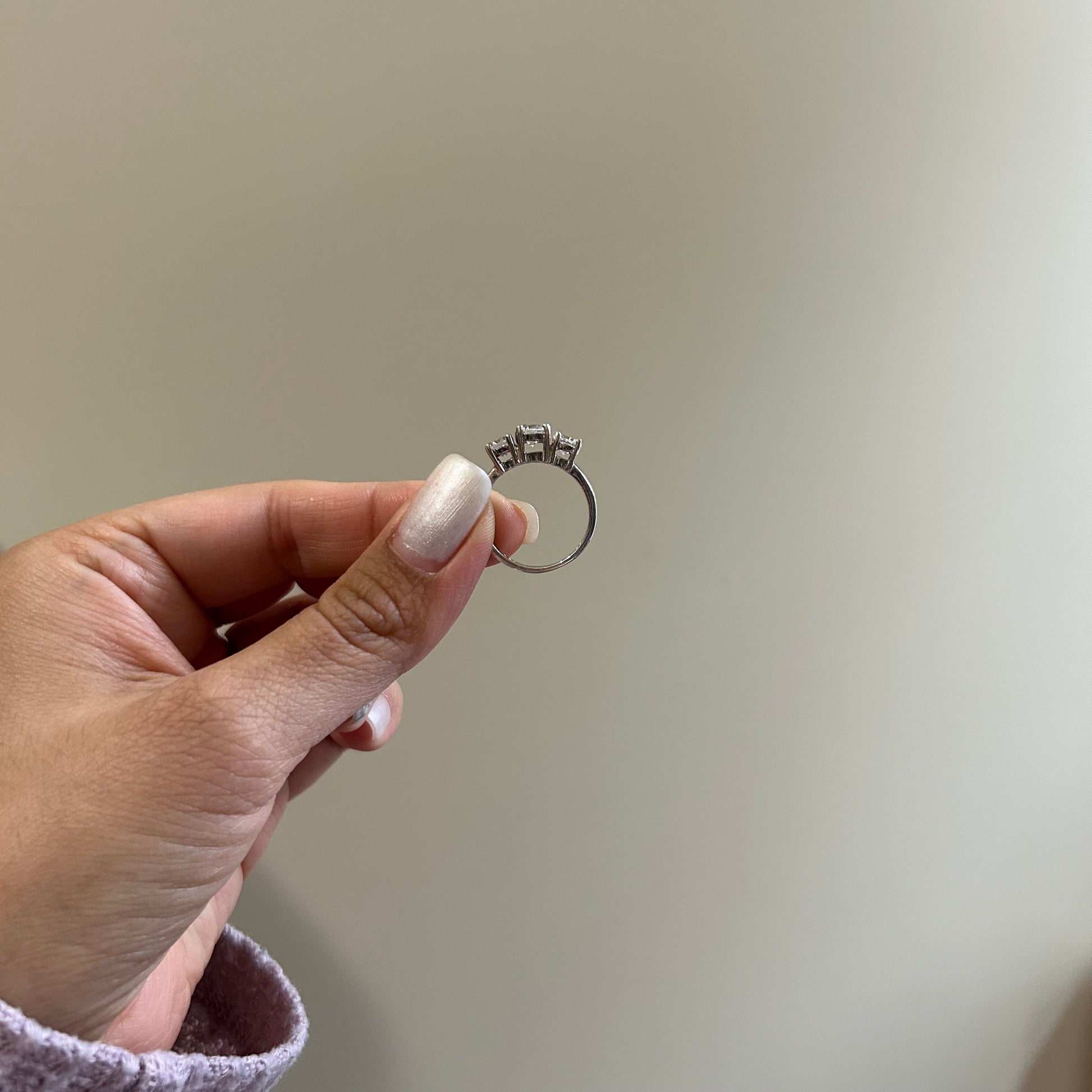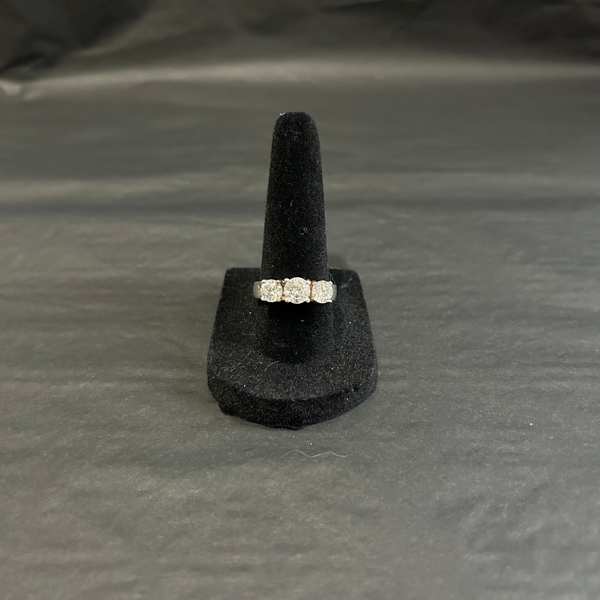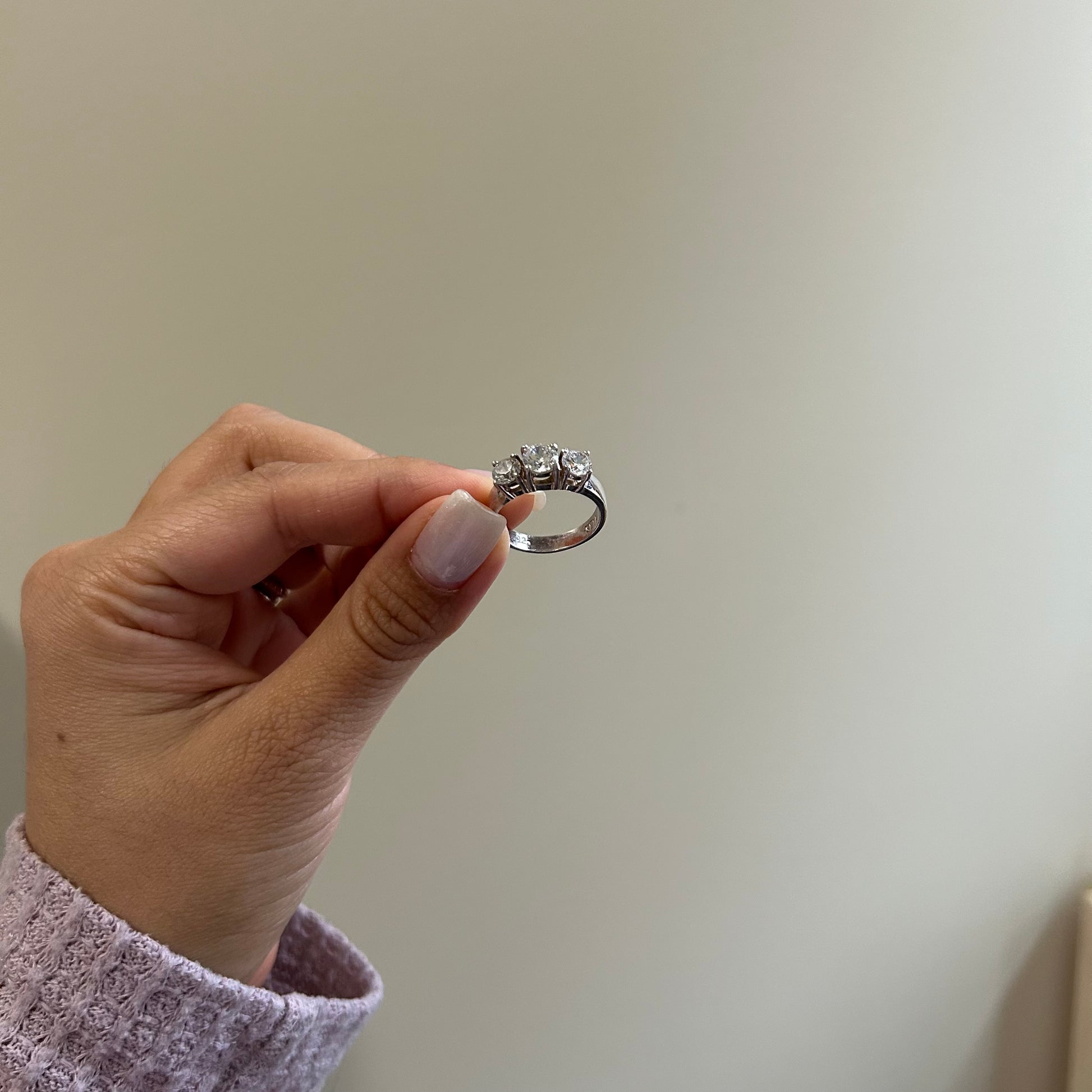 Gorgeous and sparkly vintage SETA ring. Features three round CZ stones. Band is sterling silver. Stamped 925. Ships with ring box and cleaning cloth.