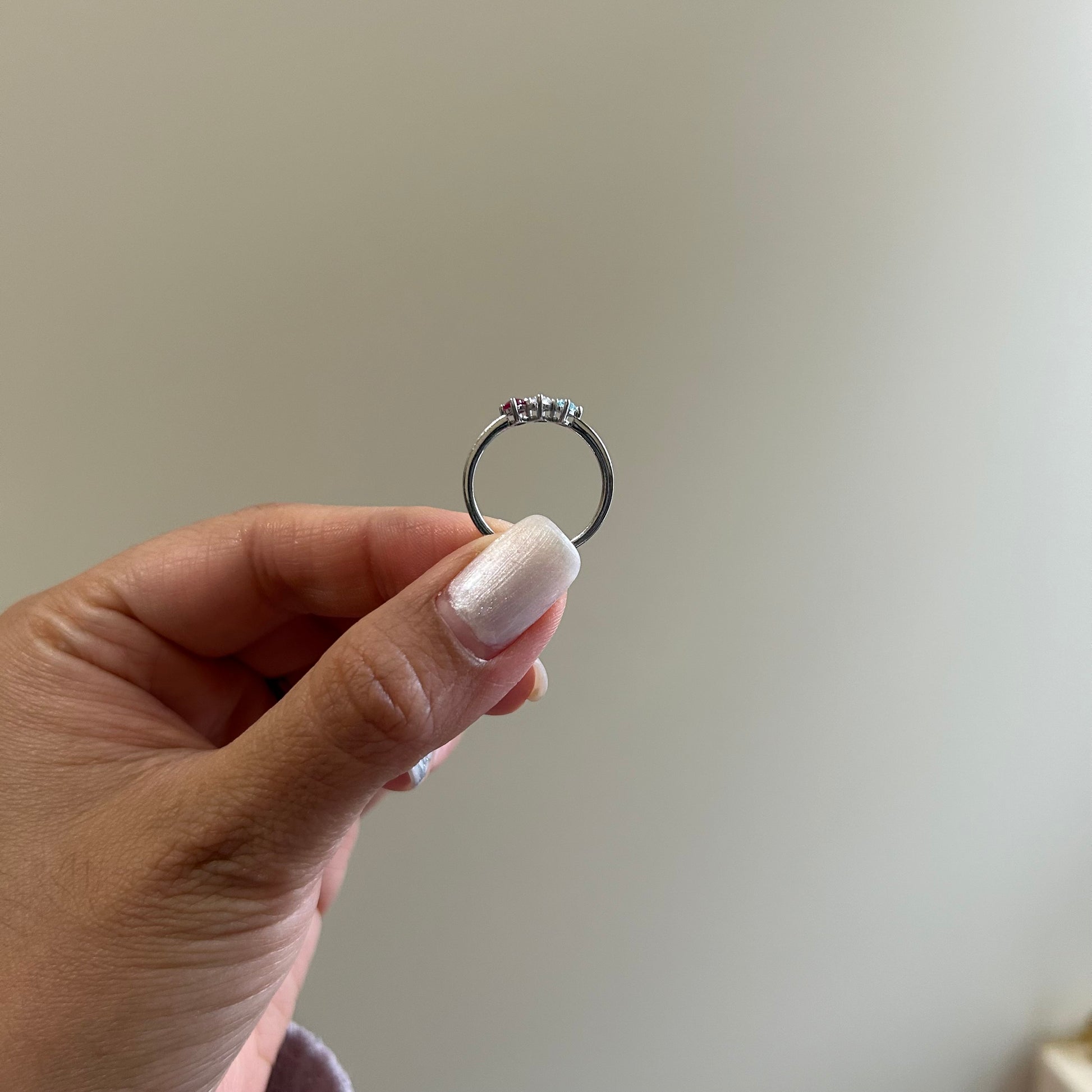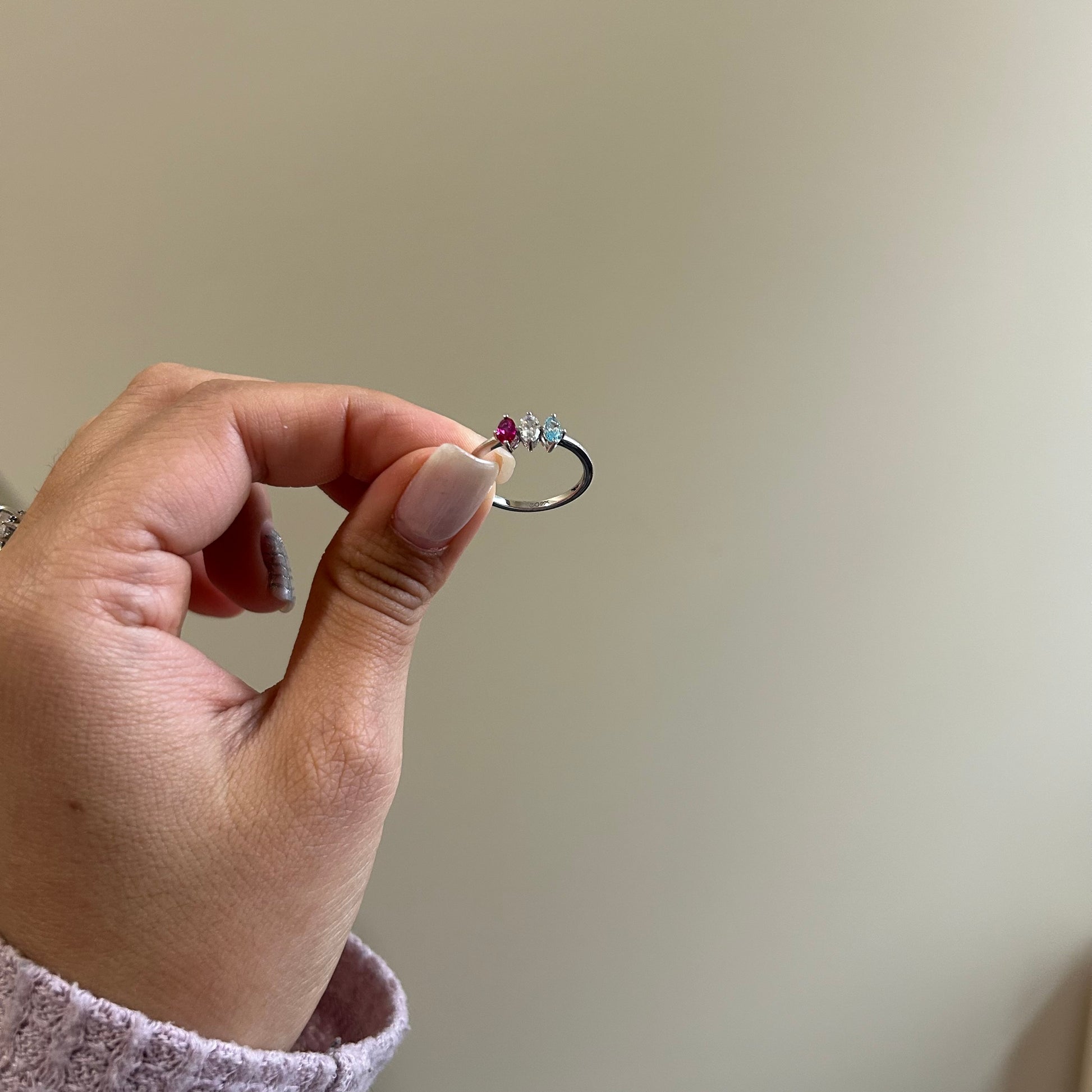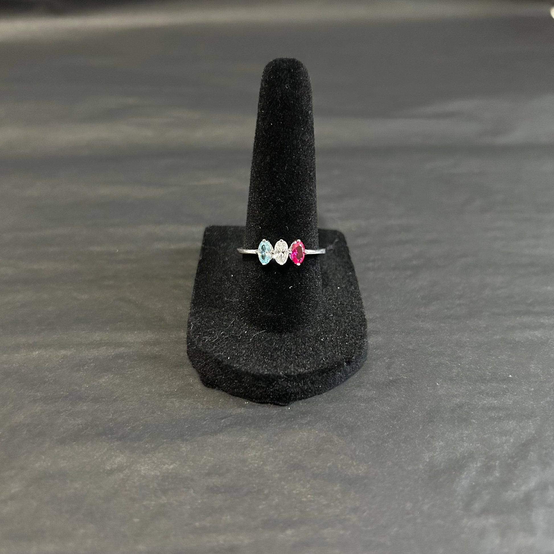 Vintage sterling silver ring with three synthetic oval gemstones. Size US 7.25. Replicates ruby, sapphire, and diamond. Stamped 925. Very beautiful and sparkly. Perfect for stacking. Ships with ring box and cleaning cloth.