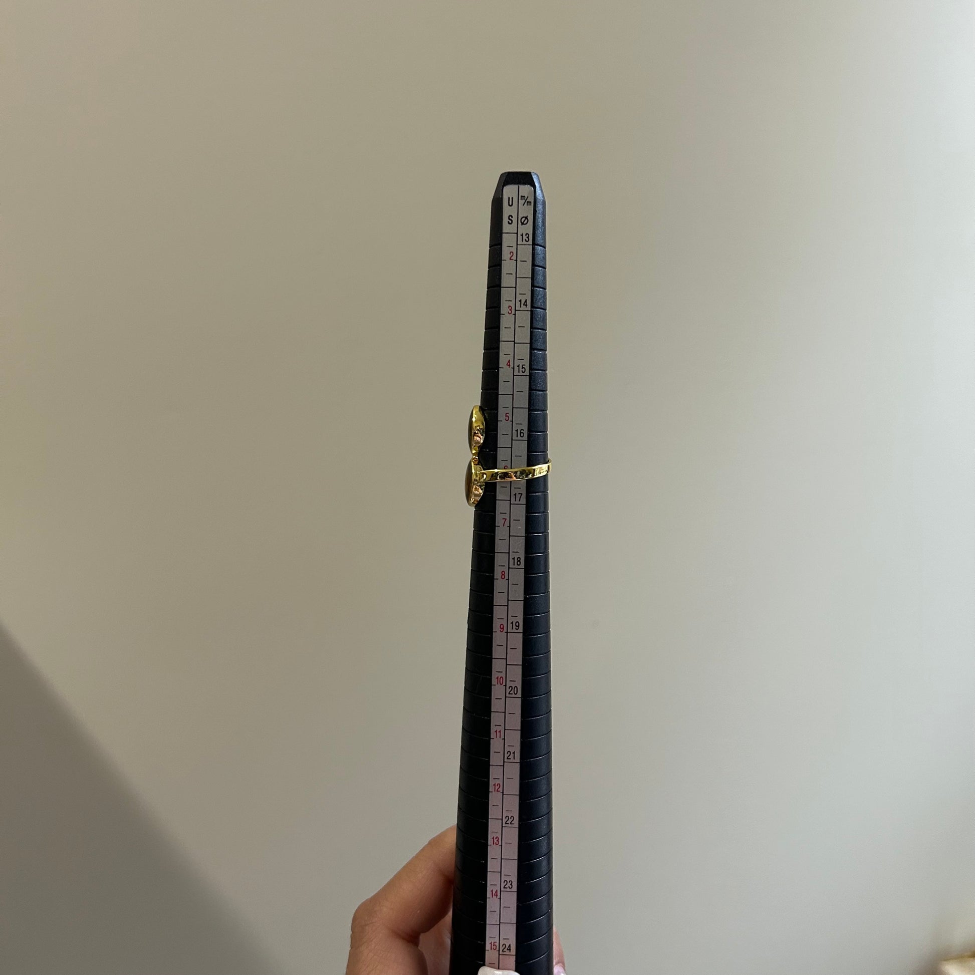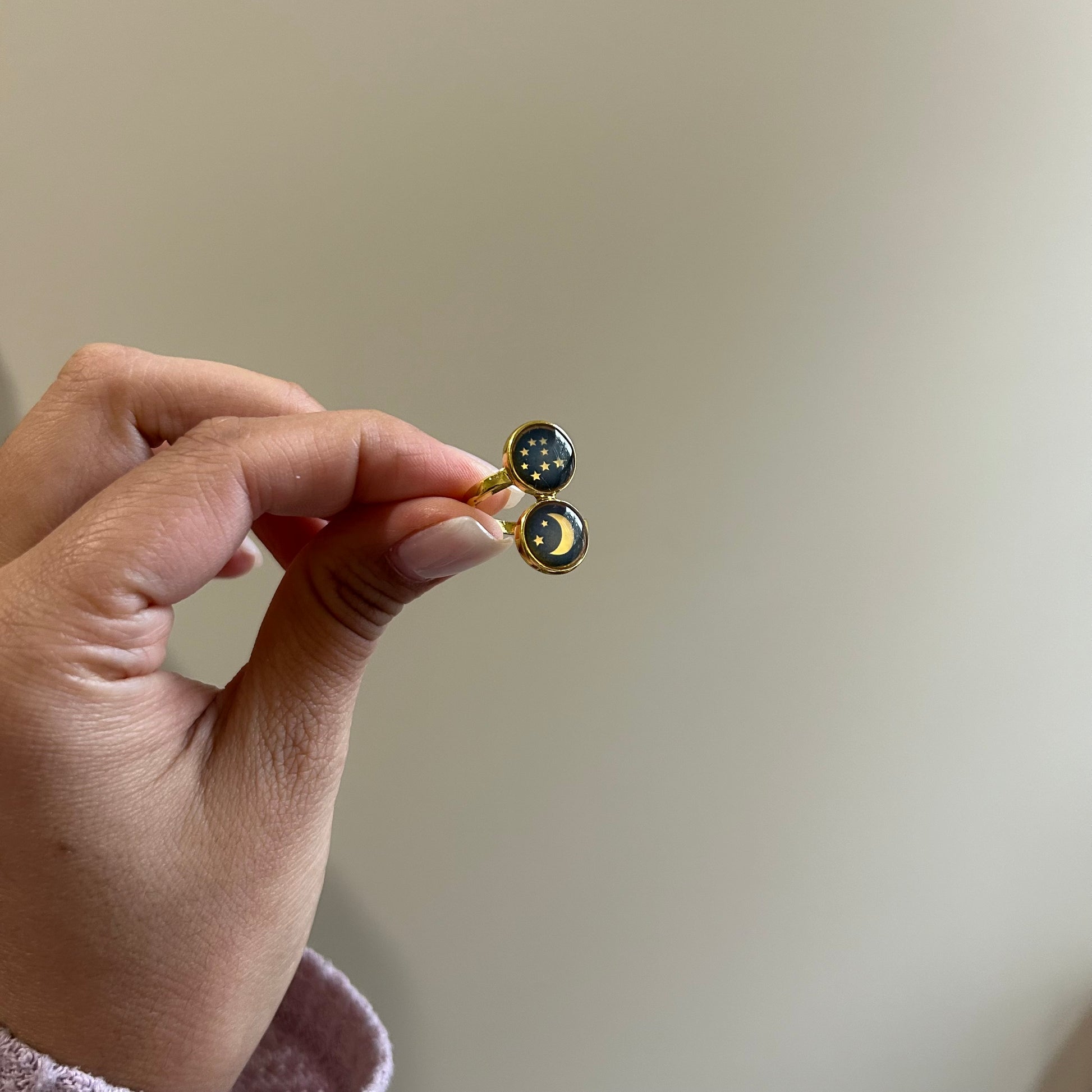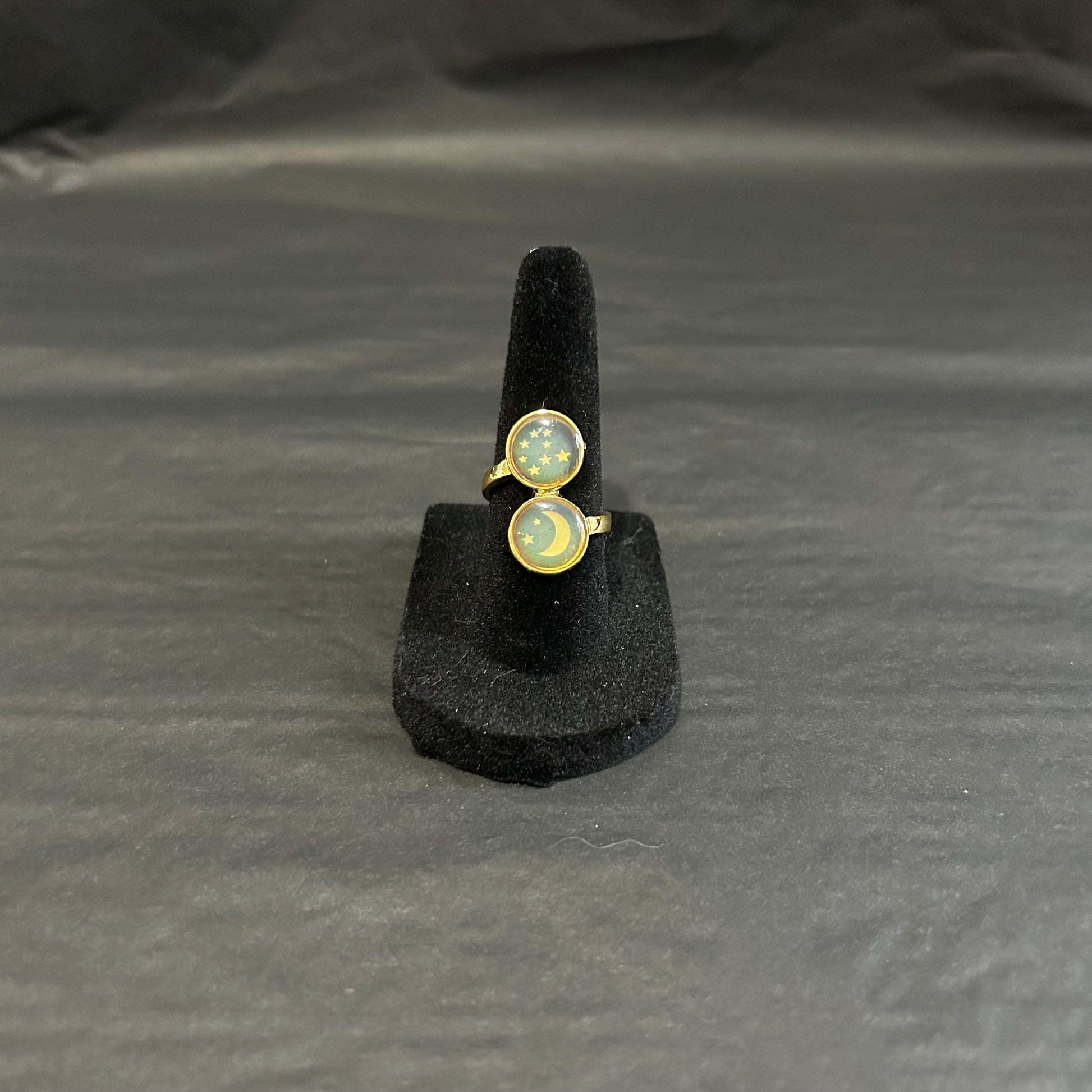 Tempted to keep this ring for myself! This is a dreamy gold ring featuring two round cabochons with moon and star designs inside. Size US 6.25. Ships with cleaning cloth.